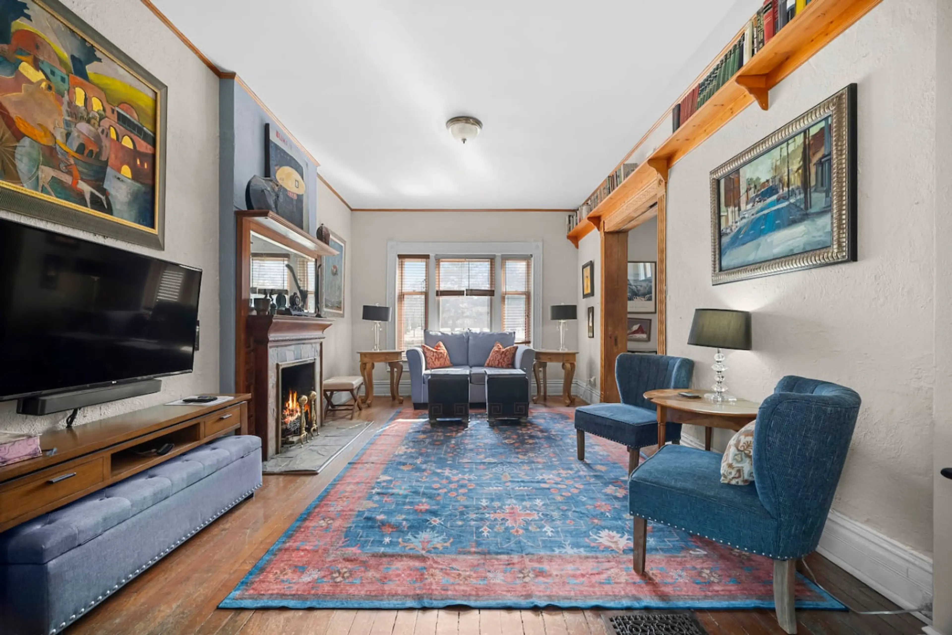 The location was super convenient to nightlife and sporting events. The owners of the house have clearly put a lot of effort into maintaining and improving this property while retaining the historical feel and introducing their artistic sensibilities. We enjoyed patronizing the neighborhood small busineses for breakfast and dinner. The house was very clean. For those of you who like privacy, before you rent please check with owner about the setup which makes the bedrooms less private than the typical property. pcommon sitting areadoor